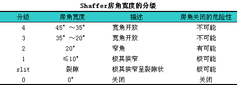 这是Shaffer(1960)出的,l是经常使用的一种分类法。它描述了在何种角度房角是开放的.在何种角度房角是关闭的。这里“角度”是指对虹膜附着于小梁网的角度的估计值(见下表)。