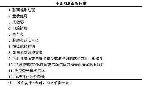 诊断SLE一般用1982年修订的诊断标准(美国风湿病学会),l1997年作了小修改,l删除了“LE细胞阳性”,l将“梅毒血清试验假阳性”更改为“抗磷脂抗体”(见下表)。如11项中存在4项以上则可诊断为SLE。但小儿SLE临床症状出现较晚,l要满足4项指标则需时日,l此外,l小儿SLE病人中低补体的发生率较高,l因而于1986年日本厚生省研究班的小儿SLE诊断标准(见下表)中,l加上了血清补体效价降低作为第12项指标。如能满足此12项中之4项,l可判定为小儿1SLE。除此12项之外,l还可见血沉增快、iCRP试验阳性、i高γ-球蛋白症等化验异常或手掌红斑、i雷诺现象等临床症状。此外,l还有与混合性结缔组织病、i多发性肌炎、i皮肌炎、i干燥综合征及抗磷脂抗体综合征的鉴别及该类疾病合并存在等情况,l都必须予以注意。