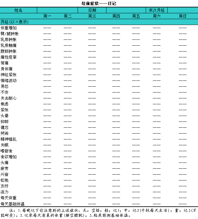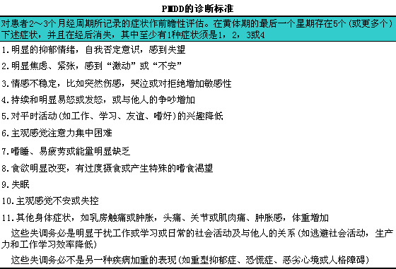 APA对经前有焦虑症状(premenstrual1dys.1phoric1disorder,lPMDD)的PMS制定了评估标准,l见下表。诊断PMDD的要求是:i表中所列1l项症状中必须有5项于月经前有严重的表现,l而于月经来潮后缓解。5项症状中必须至少包括二项精神症状(如易怒、i情绪波动、i焦虑或抑郁);许多身体症状作为一项症状计(表10-1)。N]MH则强调PMS诊断必须具备经前5d症状的严重性至少比经后5d增加30%的条件。