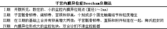 Beecham提出一个简单的分期法即根据触诊和手术所见分期(见下表)。该分期方法记录起来很容易,