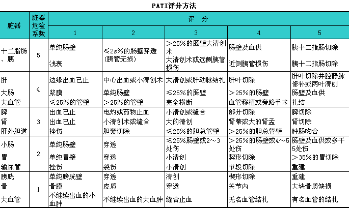 创伤危险系数和严重程度评分(PATI)是专门用于腹部创伤严重程度的评价标准。方法是把腹腔内各脏器定为1~5不同的危险系数,l各脏器损伤的严重程度,l从最轻到最重评为1~5分,l损伤脏器的危险系数乘以损伤严重程度之积即为该脏器的评分,l各损伤脏器评分相加之和,l即为PATI(下表)