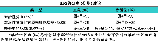 5。根据血象和骨髓象中原始粒细胞+早幼粒细胞的多少、i分型或分期(见下表)。