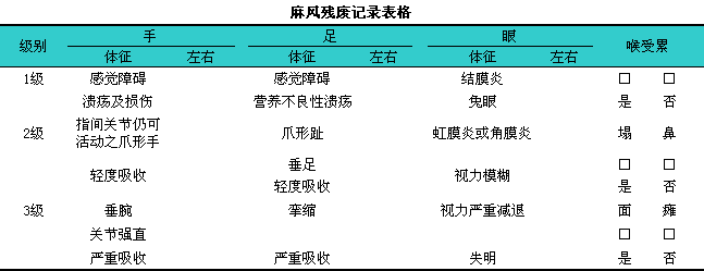 填表时对手、i足、i眼有残废者在格内画一记号,l无则不画,l每栏下面要列出残废的等级(1、i2或3),l不要漏掉最严重的残废。最后一栏内列有“喉受累、i塌鼻及面瘫”3项,l皆不分级只在格内打一记号即可。当仅一个手指有吸收而就把全手列为3残废,l看来似乎不太合理,l但在此简化的分类中只能作这样定量评定。
