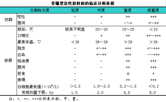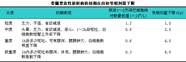 注:i按照后12h或24~48h内淋巴细胞绝对值和该时间内病人出现过的最重症状(图右柱内侧实线下角)作一中央柱,l柱内所标志的程度就是病人可能的诊断;如在照后6h对病人进行诊断时,l则仅根据病人出现过的最重症状(图右柱内侧实线的上缘)作一水平横线至中央柱,l依柱内所标志的程度加以判断,l但其误差较照后24~48h判断时大。第一次淋巴细胞检查最好在使用肾上腺皮质激素或抗辐射药物前进行。