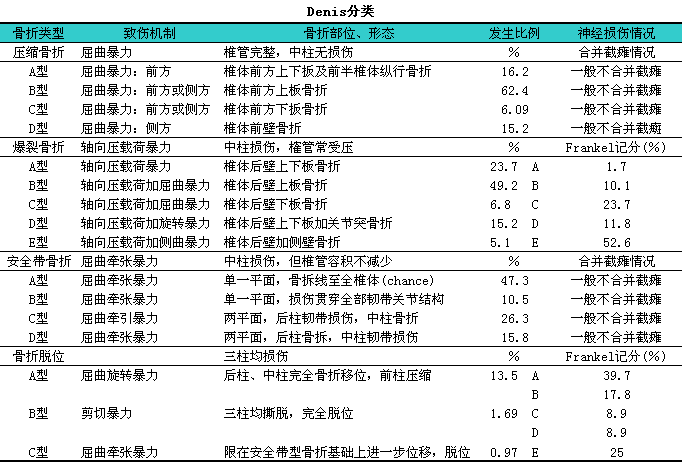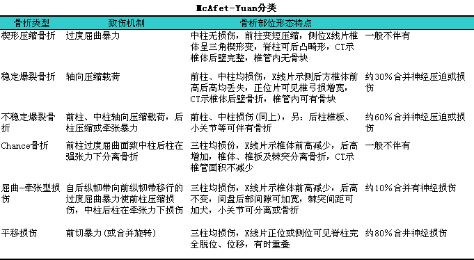 目前国际通用的Denis分类法(见下表)具有很多优点,l其反映了致伤机制和骨折的形态及稳定性,l缺点是过于复杂。McAfee-Yuan分类法(见下表)比较简明实用,l但其把屈曲牵张损伤中的Chance骨折单独列出,l有时不易鉴别。作者在McAfee-Yuan分类的基础上提出五型分类法。