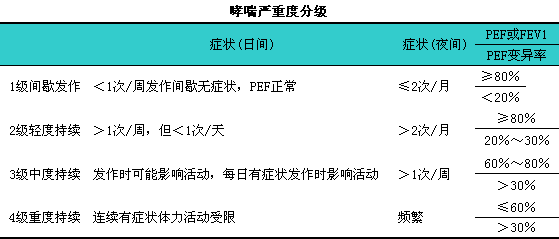 1.治疗前哮喘病情严重程度评估对新发生的哮喘患儿和既往已被确诊哮喘而长时间未应用药物治疗的患儿,l根据喘息发作的频率、i程度、i肺功能情况进行评估,l分成4级见下表。根据病人出现这一级中的任何一种严重征象,l就可将病人归入该级中。并应牢记:i属任何一级的病人,l甚至是间歇发作的哮喘病人均可发生严重的哮喘发作。