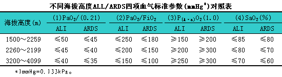 1.建立高海拔地区ARDS诊断标准的必要性:i受高海拔地区低气压、i低氧分压及高原环境综合暴露因素影响,l以低氧分子生理生物学为主轴,l启动了全身系统器官的生理、i病理生理改变,l海拔越高,l病理生理变化越重,l临床症状、i体征也越显著。急进高原3780m现场,lALI绵羊内毒索模型和平原同类模型比较,l肺淋巴流量增加了2.3倍,l肺通透表面积增加了1.5倍。血气、i血流动力学、i生化指标和平原相比差异十分显著。海拔3200m现场ALI小鼠模型24h累积死亡率为97%,l相同平原模型为22.9%。根据临床资料,l当海拔≥1500m时,l有关ALI/ARDS的血气参数即和平原分离开来。例如PaO2(0.21)测定为60mmHg(1mmHg=0.133kPa)或1PaO2/FiO2≤300mmHg在平原即被定为ALI/ARDS,l但在≥1500m时此值却被视为正常低限,l无碍生活和工作。由于生物个体适应模式诸多差异,l当海拔达到2260m时已可见到高原应激反应及高原肺水肿的记载,lARDS临床症状、i体征、i血气参数和平原相比,l差别更趋明显。大量资料还表明,l直接影响ALI/ARDS的血气、i酸碱平衡、i红细胞功能、i炎性效应细胞因子、i介质可能在特定的高原环境下形成某些占优势的启动网络。因此,l制定符合高海拔地区的ALI/ARDS诊断标准(简称标准)有十分重要的临床意义。