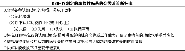 DSM-Ⅳ的血管性痴呆的诊断标准(见下表)在新发表的第Ⅳ版,l名称被修改为血管性痴呆(vascu-lar1dementia),l以前的诊断标准中所使用的多发梗死性痴呆用括号进行标注。但是,l诊断标准几乎沿袭了多发梗死性痴呆的版本。