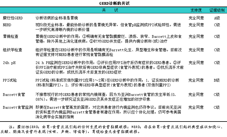 夏威夷讨论的目的是就GERD的诊断、i发病机制、i治疗、i初级保健中的处理程序4个方面达成亚太共识。工作组的成员根据循证医学原理,l按可利用证据的级别(A级:i设计很好的随机对照研究;B级:i设计很好的队列或病例对照研究;C级:i病例报告或设计较差的研究;D级:i个人的观察意见)对共识的每一条叙述表明自己的支持程度(完全同意;同意;不同意;完全不同意)。