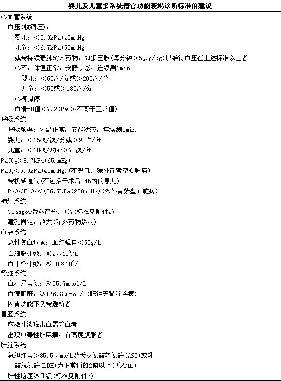 多系统器官功能衰竭(multiple1system1organ1failure,1MSOF)是20世纪70年代以来命名的一个新的临床综合征,l是指两个以上(含两个)器官或系统序贯或同源发生功能衰竭。最初在外科领域报道并得到确认,l20世纪80年代在国内儿科学界也开始引起重视,l并于1988年制定过小儿MSOF诊断标准,l但较繁琐,l且有的缺乏量化指标。第四届全国儿科急救学术研讨会,l参考Wilkinson小儿MSOF诊断条件,l提出了本综合征诊断标准的建议。至于将哪些器官系统包括在MSOF之内,l由于年代不同,l意见也不一致。目前倾向于列入肺、i循环、i肾、i肝、i消化、i中枢神经及血液7个器官系统。20世纪70年代认为,l若某一器官功能衰竭是MSOF患者的基础疾病时,l该脏器应除外,l如感染性休克引起肾衰只能算肾脏一个器官衰竭,l而感染性休克作为基础疾病不能算衰竭脏器。同理20世纪80年代我国有些学者对肺炎呼吸衰竭合并心力衰竭,l只算心脏一个器官功能衰竭。本次会汶代表们认为从重视MSOF这一立场出发,l上述情况应视为已存在两个器官功能衰竭,l因为既存疾患的脏器由于MSOF的发生.功能不全必然增重。MSOF这一新的综合征,l是急诊医学中大家关注的热门课题之一,l因专业和研究角度不同,l学者们对它的诊断标准至今尚未完全统一。我们希望随着基础研究逐步深入及临床资料不断积累、i丰富,l能对现在提出Ms0F诊断标准,l进一步充实和完善。