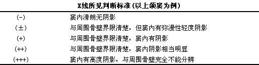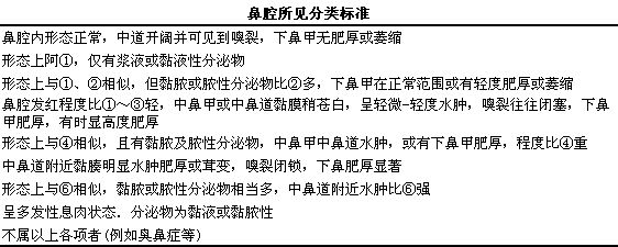 判断标准如下表:i鼻腔所见(见下表)①、i②为正常,l③~⑨判为鼻窦炎。X线所见(-),l(±)为正常,l(+)~(+++)窦内有明显阴影者判为鼻窦炎。本文讨论以上颌窦为主,l左右所见不同时,l以病变严重的一侧为判断结果。综合判断是把鼻腔所见与X线所见混合分为5个阶段,l即“正常”与“微”为正常,l“轻”“中”“重”判为鼻窦炎。