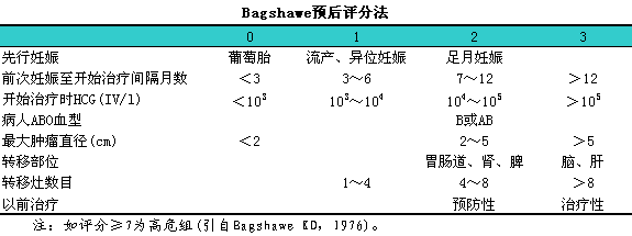 Bagshawe制定了妊娠滋养细胞肿瘤的预后评分法(见下表)。