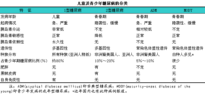 为了有利于明确诊断,lRosenbloom等提出T儿童及青少年糖尿病的几种分类(见下表)。
