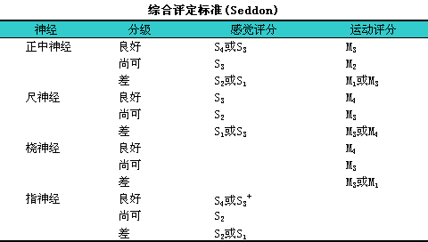运动感觉的综合评定标准──Seddon评定法(见下表)。