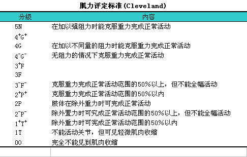 3.Cleveland肌力评定标准。上肢的正中神经、i桡神经、i尺神经的近侧和远侧肌肉为:i正中神经──近侧肌肉,l旋前圆肌、i桡侧腕屈肌、i指浅屈肌、i拇长屈肌;远侧肌肉:i拇短展肌。桡神经──近侧肌肉,l肱桡肌、i桡侧腕长伸肌、i指总伸肌、i尺侧腕伸肌;远侧肌肉:i拇长展肌、i拇长伸肌、i示指固有伸肌。尺神经──近侧肌肉,l尺侧腕屈肌、i指深屈肌(环指、i小指);远侧肌肉,l小指展肌、i骨间肌(见下表)。