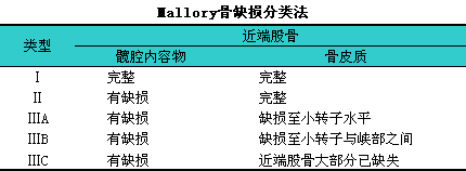 Mallory分类(见下表)亦是基于考虑是否能应用非骨水泥翻修假体而提出的。此分类法已涉及髓腔内皮质骨缺损的情况,