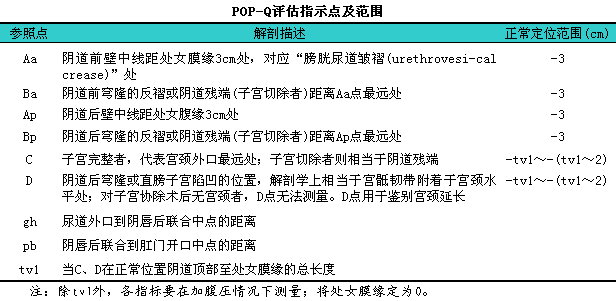 POP—Q以处女膜为参照(0点),l以阴道前壁、i后壁和顶部的6个点为指示点(前壁2点Aa、iBa,l后壁2点Ap、iBp,l顶部2点C、iD),l以6点相对于处女膜的位置变化为尺度(指示点位于处女膜缘内侧记为负数,l位于处女膜缘外侧记为正数),l对脱垂做出量化。同时记录阴道全长(total1vaginal1length,l1tvl),l生殖道裂孔(genital1hiatus,lgh)长度、i会阴体(perineal1body,lpb)长度的情况。各参考指示点及正常定位范围见下表,l盆腔器官脱垂的分度标准见下表。