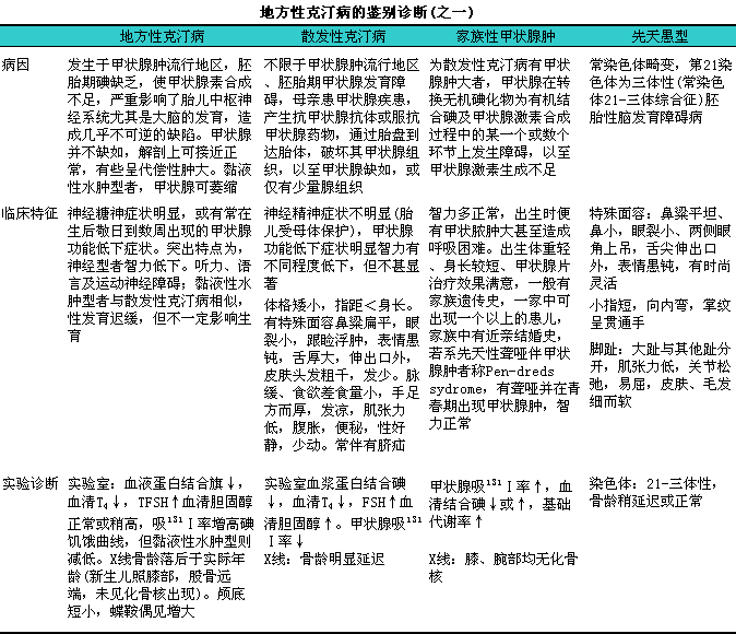 有上述必备条件,l再具有辅助条件中神经系统或甲状腺功能低下症任何一项或一项以上,l而又可排除分娩损伤、i脑炎、i脑膜炎及药物中毒等病史者,l即可诊断为地方性克汀病。如有上述必备条件,l但不能排除引起类似本病症状之其他疾病者,l可诊断为疑似患者。