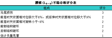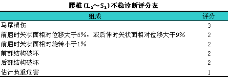 4.在生物力学研究基础上进行动力性摄片,l测量椎体间的相对位移,l不仅可对腰椎不稳做出明确诊断,l还可对腰椎稳定程度定量评价,l是诊断腰椎不稳的主要手段和依据。Nachemson,l提出腰椎椎体间相对水平位移在屈/伸侧位片上大于3mm,l角位移大于10°时为不稳定,l腰骶关节则分别为4mm和20°。Boden和wiesel则提出腰骶关节不稳时水平位移应在3mm以上。Posner等还采用计算相对位移即水平位移与上一椎体前后径比值的方法,l避免由放大系数所造成的误差,l其测量标准是,l腰椎屈、i伸时水平位移分别大于2.3mm(8%)和2.8mm(9%),l角位移前屈时小于-9°为不稳;而腰骶关节前屈不稳时水平位移大于1.6mm(6%),l角位移小于1°。他们采用评分方法来诊断腰椎不稳(见下表),l以总分大于或等于5者为腰椎不稳。Weiler等采用水平位移与角位移的比值来反映腰椎的稳定程度,l发现正常人该比值为25.5,l而退行性腰椎不稳者该比值可升至37.3。