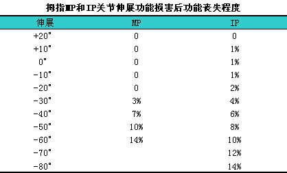 拇指MP和IP关节伸展功能损害后功能丧失程度见下表。