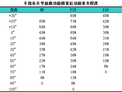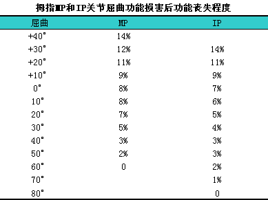 拇指MP和IP关节屈曲功能损害后功能丧失程度见下表。