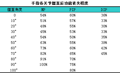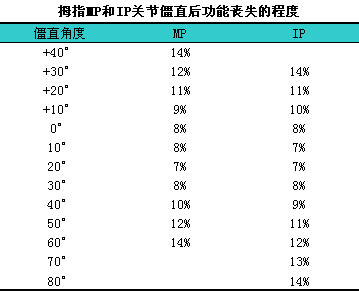 拇指MP和IP关节僵直后功能丧失的程度见下表。