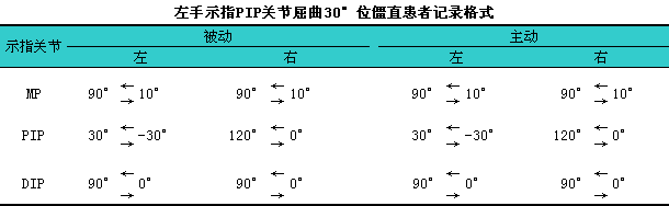 手部关节活动度的记录和测量:i将中立位定为0°。从中立位起关节能弯曲的度数为屈曲度数,l从届曲位向中立位方向活动为伸。伸超过中立位称为“过伸”,l其度数记录为正数值;而伸直动作未能达到关节的中立位时,l则记录此关节伸的度数的方法是将伸直久缺度数以负值表示,l此为国际上手外科界普遍采用的记录方法。试以一左手示指PIP关节在屈曲30°位僵直的患者(右侧为正常)为例说明通常的记录格式(见下表)。