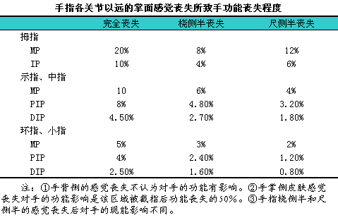 1.手指感觉功能丧失:i手指各关节以远的掌面感觉丧失所致手功能丧失程度见下表。