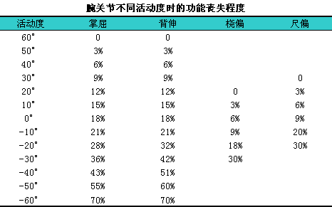 在腕关节的四个方向的运动中,l掌屈和背伸占70%的功能,l桡偏和尺偏占30%的功能。腕关节的正常活动范围是60°(背伸)与60°(掌屈),l20°(桡偏)与30°(尺偏)。腕关节功能的完全丧失相当于一上肢丧失60%的功能。腕关节不同的活动度时的功能丧失程度见下表。