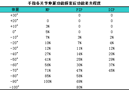 手指各关节伸展功能损害后功能丧失程度(AMA法)见下表。