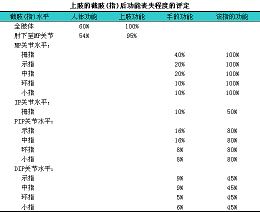(一)上肢的截肢(指)后功能丧失程度的评定(见下表)