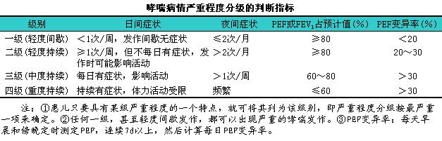 1.患儿病情严重程度评估。包括新发生的哮喘患儿和既往已经被诊断为哮喘而长时间未规范应用药物治疗的患儿。一般根据治疗开始前1个月内喘息发作的频率、i程度、i肺功能情况进行评估,l分为4级(见下表)。