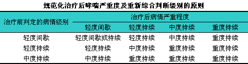 2.规范化治疗期间患儿病情严重程度评估。当患儿已经处于规范化治疗期间(一般1个月),l对病情控制不理想的患儿应重新进行哮喘病情严重程度的评估,l根据其目前病情的严重程度和治疗前的级别进行综合判断,l确定患儿病情的实际严重级别。以指导下一步的治疗(见下表)。