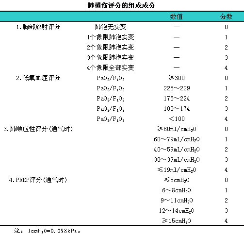 病人最终得分等于总分数/成分数。零分为无肺损伤;0.1~2.5分为轻至中度肺损伤;>2.5分为重度肺损伤(ARDS)。该评分扩大了败血症后急性肺损伤的观察范围,l也为追踪急性肺损伤病人的生理改变提出了半定量的方法(见下表)。