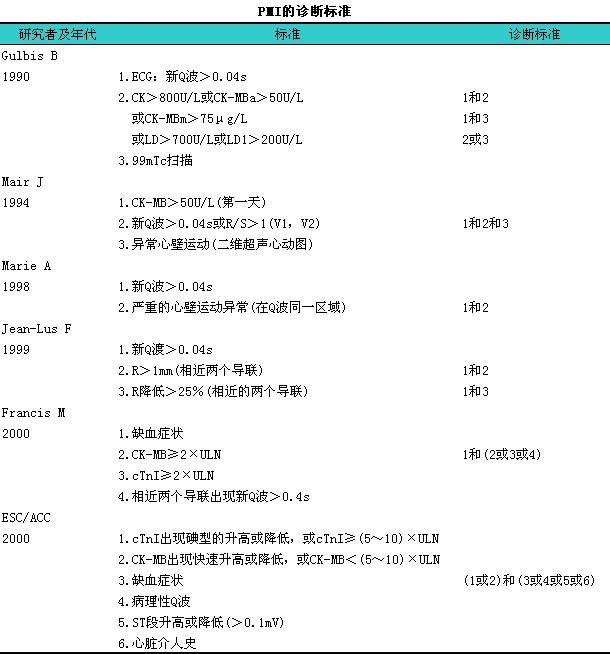 目前,l尚无真正的PMI“诊断标准”。正在使用的PMI诊断标准是从AMI的诊断标准衍化而来。1WHO推荐的AMI诊断标准包括病史、iECG变化和心肌酶学变化。由于下列原因,l不能依据AMI的诊断标准诊断PMI:i①PMI发生时,l患者常意识不清,l且手术造成的痛苦常掩盖了PMI的症状。②手术、i插管、i水电解质失衡造成ECG非特异性改变。③即使无PMI发生,l手术对骨骼肌和心肌的损伤常造成血清CK、iLD、iLD1、iCK-MB、i肌红蛋白、icTnT和cT-nI升高。由于没有推荐的“金标准”,l不同研究者使用了不同的诊断标准(见下表)。