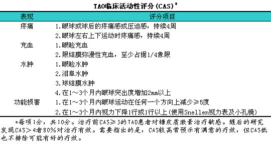 Mourits等(1989)提出一种评价TAO活动性的评分标准,l即临床活动性评分标准,l即临床活动性评分(clinical1activity-1score,lCAS),l能够评估疾病进展以指导免疫抑制治疗(见下表)。