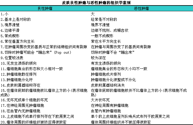 当然,l对良性与恶性肿瘤的鉴别不能单靠某一条标准,l而应综合所见,l进行平衡,l最重要的是标准的前几条,l也就是大小、i对称、i境界及边缘这几条。有时也可有例外,l如核的不典型性一般意味着恶性,l但也可见于角化棘皮瘤等。又如片状坏死一般见于恶性肿瘤,l但也可见于小汗腺汗孔瘤,l而后者是良性的。