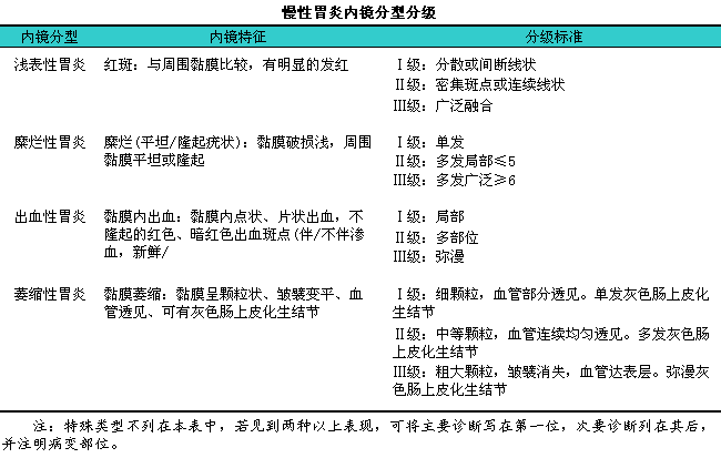 消化内镜学会2003年9月于大连召开了全国慢性胃炎专题讨论会,l会前曾组织国内部分专家讨论慢性胃炎的内镜分型分级标准,l经充分研讨提出不同意见,l最后提交大会讨论,l并对这一分型分级标准进行投票,l投票者近300人,l完全同意和基本同意者占94.6%。同年12月在上海进行了最后定稿,l现将结果公布如下,l以供同道参考试行,l以便进一步修订完善。