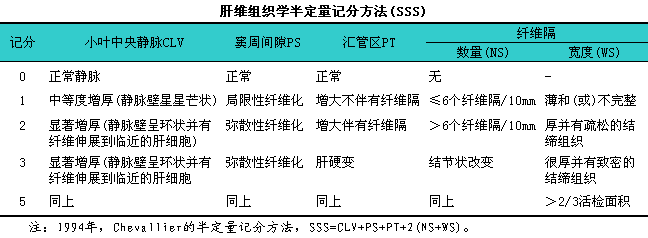 半定量记分系统(semiquantitative1scoring1sys-tem,lSSS)1994年法国Cheveallier1et1al(hepatology,l1994;20:349~355)首先提出了将纤维化形式与数量相结合的SSS来评判肝纤维化的程度(见下表),l此方法将纤维组织主要的沉积部位:i小叶中央静脉(centrilobular1vein,lCV)、i窦周间隙(perisi-nusoidal1space,lPS)、i汇管区(portal1tract,lPT)以及纤维隔的数量(number1of1septa,lNS)和宽度(width1of1septa,lWS)分别记分后再计算总分,l其记分公式:iSSS=CLV+PS+PT+2(NS+WS),l并对200例肝活检标本进行了观察,l发现SSS记分值与通过计算机图象分析仪测定得的胶原面积密度有良好的一致性。