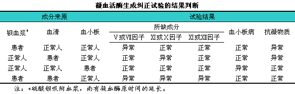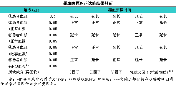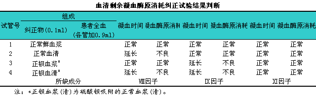在以上检查项目中,l以白陶土部分凝血活酶时间为最灵敏,l但还不能作出血友病类疾患的鉴别诊断。若血清剩余凝血酶原消耗异常,l则可进行纠正试验以助诊断。其结果判断见下表。