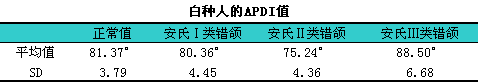 APDI值=面平面与FH平面夹角±AB平面与面平面夹角±腭平面与FH平面的夹角(当腭平面向前下倾斜时为正值,l当腭平面向前上倾斜时为负值,l当B点位于A点的后方时为负值,lB点位于A点的前方时为正值)(见下表)