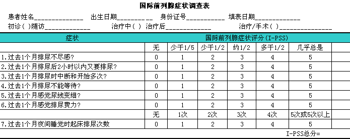 I-PSS:i该表由病人自己填写,l每个问题答案分为0~5级,l病人可以从其中选择一个答案以表示该症状的发生频率。总分范围为0~35(从无症状到症状严重)。症状积分的表示方法为I-PSS(0~35)。病人可以如下分类:i0~7=轻度,l8~19=中度,l20~35=重度。