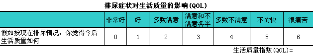 QOL(图4-2):i附于I-PSS表之下,l为调查病人在今后生活中对目前症状的耐受程度。答案范围从非常好至很痛苦,l或0~6分。尽管该调查表不能全面了解LUTS对生活质量的印象,l但因此医师对病人疾病的严重程度有初步的影响。生活质量评估结果表示为QOL(0~6)。
