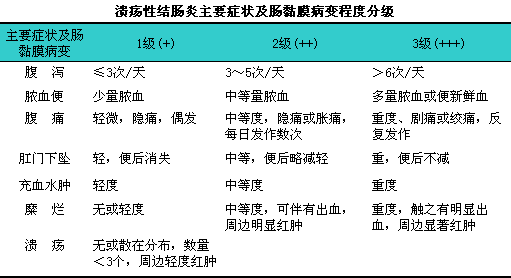 2)临床严重程度分级:i轻度:i患者腹泻每日4次以下,l便血轻或无,l无发热、i脉搏加快或贫血,l血沉正常。中度:i介于轻度和重度之间。重度:i腹泻每日6次以上,l明显黏液血便,l体温在37.5℃以上,l脉搏在90次/分以上,l血红蛋白<100g/L,l血沉>30mm/h。