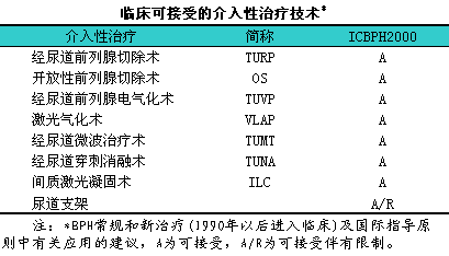 如治疗成功,l病人对疗效满意,l应依据初始评估的项目每年对病人进行随访。随访的目的是医生们能及时发现在过去的1年中所出现的变化,l尤其是症状进展或变得更为痛苦。或如出现有手术指征的合并症。如治疗失败和病人对疗效不满意,l应重新评估并选择其他治疗。如选择介入性治疗,l检查结果提示存在膀胱出口梗阻,l如Qmax<10ml/s,l病人和医生之间应该讨论各种介入性治疗的益处和危险性。TURP仍然是介入性治疗的“金标准”,l也可选择目前已有的其他新的介人性治疗方法。已在临床得到应用的新技术详见下表。
