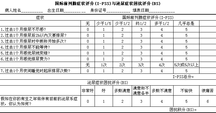 1)国际前列腺症状评分(I-PSS):i如病人主诉1LUTS,l建议采用问卷表客观记录病人症状的频数。I-PSS包含有7个问卷题(见下表),l仍被保留作为建议性检查方法。其他得到认可的症状问卷表有DAN-PSS-1和ICSmale问卷表。I-PSS问卷表为病人自我评价问卷表。每个答案为0~5个等级。每个问题允许病人从6个等级(0~5)选出1个等级以表示某一特殊症状的频率。总分为0~35分(无症状至症状极为严重)。症状积分为I-PSS从0~35分。病人可进行如下分类:i①0~7=轻度症状。②8~19=中度症状。③20~35=重度症状。无论采用何种问卷表,l需要同时了解每个问卷题的回答和问卷表的总评分。这些问卷表可以作为病人基础资料以及病人症状的改变(治疗或无治疗)。
