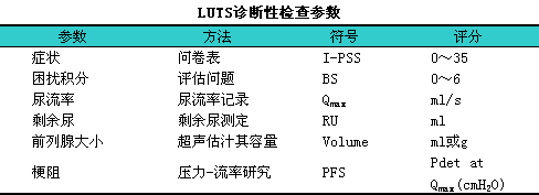 2)泌尿外科(专科)评估选择性检查:i①尿流率。②剩余尿。③压力-流率研究。④经腹或TRUS前列腺显像。⑤超声或IVU上尿路显像。⑥下尿路内腔镜。诊断性检查参数见下表。