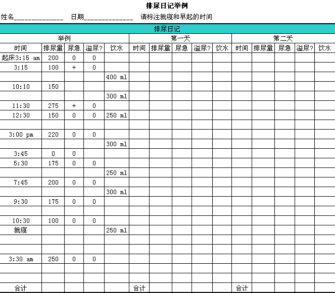 (6)排尿日记(频率-容量图,l见下表):i如夜尿为主要症状时排尿日记甚有价值,l记录24h的排尿日记有助于鉴别夜间多尿和饮水过量,l这些情况在老年男性较为常见。