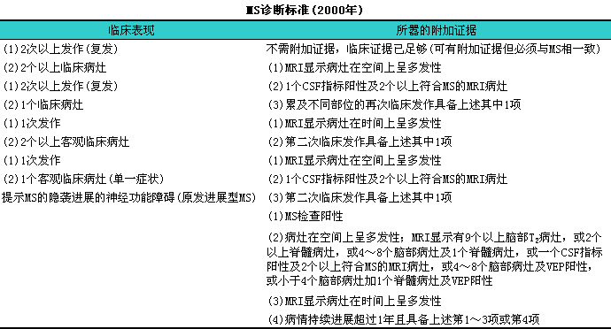2000年,l美国国立MS协会和国际MS协会联合推荐的MS诊断标准,l在Poser诊断标准的基础上作了改进(见下表)。