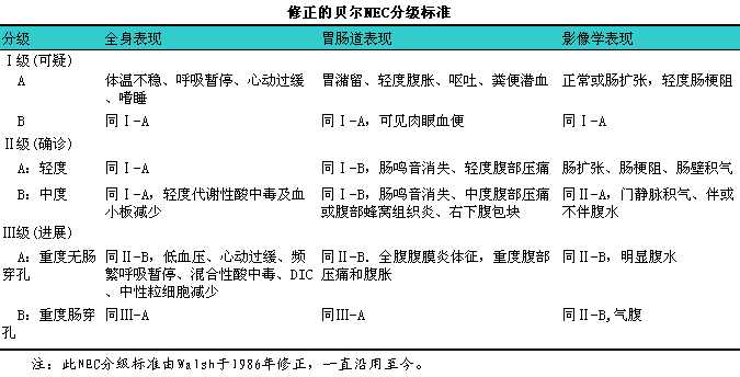 NEC的临床表现差异很大,l既可以表现全身非特异性败血症症状,l也可以表现经典的胃肠道症状,l如腹胀、i呕吐及便血三联征。对不具有典型腹部体征及放射影像学依据的病例,l诊断较难。目前临床多采用修正的贝尔NEC分级标准,l见下表。